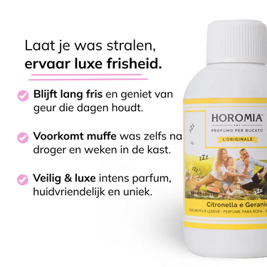 Horomia is dé favoriete wasparfum uit Italië. Dankzij zorgvuldig geselecteerde geurcomposities ruikt je was niet alleen uitzonderlijk fris, maar blijft de geur ook dagenlang hangen in je kleding én je huis. Eén keer proberen, en je wilt nooit meer zonder.