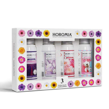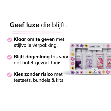 Elke giftset bevat een zorgvuldig samengestelde combinatie van geurproducten, zoals wasparfum, textielspray of geurzakjes. De inhoud kan variëren per set, maar altijd met de kenmerkende Horomia-geuren en luxe presentatie.
