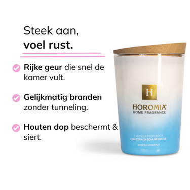 Horomia Geurkaars Brezza Minerale brengt een kalme strandbries in huis met frisse topnoten van zeezout, sering en witte lelie. Het hart combineert fenegriek, cyclamen en minerale tonen, terwijl tonkaboon, patchouli en gezouten muskus zorgen voor een warme, diepe basis met een subtiele oceaanfrisheid. Perfect voor momenten van ontspanning.