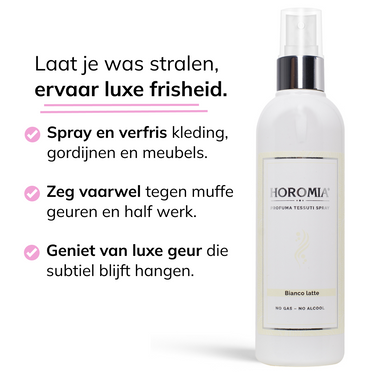 Horomia is dé favoriete textielspray uit Italië. Dankzij verfijnde geurcomposities ruikt je textiel niet alleen heerlijk fris, maar blijft de geur ook dagenlang hangen in je kleding én je interieur. Eén keer gebruiken, en je wilt nooit meer zonder.