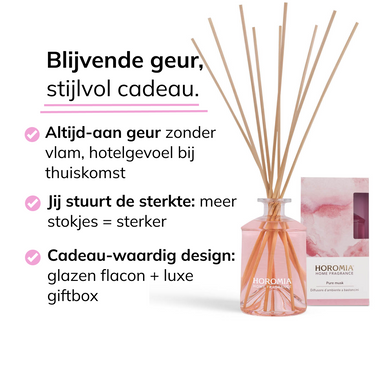Horomia Geurstokjes Pure Musk: elegante glazen flacon met een warme, verfijnde geur. Topnoten van limoen en anjer, een bloemig hart van roos en jasmijn, en een sensuele basis van muskus, vetiver, tonkaboon en vanille. Zorgt voor een langdurige, luxe en romantische sfeer in huis.