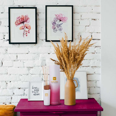 Plaats de rotanstokjes in de flacon met geurende olie. De stokjes absorberen de olie en verspreiden de geur gelijkmatig in de ruimte. Voor een intensere geurbeleving kun je de stokjes af en toe omdraaien.