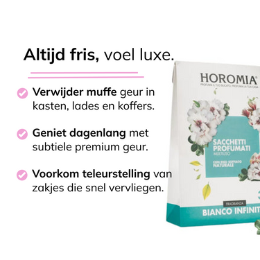 Horomia is dé favoriete geurzakjeslijn uit Italië. Dankzij verfijnde geurcomposities ruikt je kast niet alleen heerlijk fris, maar blijft de geur ook wekenlang hangen in je kleding én je huis. Eén keer proberen, en je wilt nooit meer zonder.