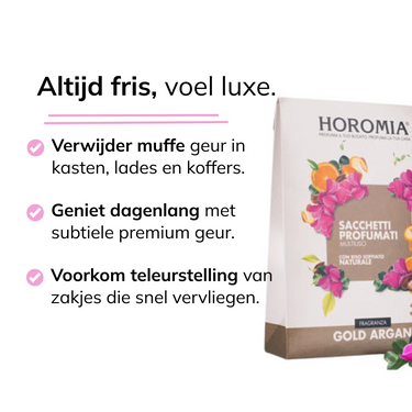 Horomia is dé favoriete geurzakjeslijn uit Italië. Dankzij verfijnde geurcomposities ruikt je kast niet alleen heerlijk fris, maar blijft de geur ook wekenlang hangen in je kleding én je huis. Eén keer proberen, en je wilt nooit meer zonder.