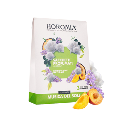 Horomia geurzakjes Musica del Sole bevatten natuurlijke gepofte rijst en verspreiden tot 12 weken een zonnige geur van perzik, witte musk en cederhout. Geschikt voor kledingkasten, lades, wasdroger, stofzuiger, auto en vacuümzakken.