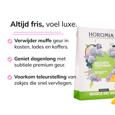 Horomia is dé favoriete geurzakjeslijn uit Italië. Dankzij verfijnde geurcomposities ruikt je kast niet alleen heerlijk fris, maar blijft de geur ook wekenlang hangen in je kleding én je huis. Eén keer proberen, en je wilt nooit meer zonder.