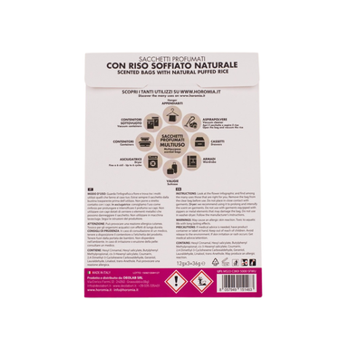 Horomia geurzakjes Petali di Peonia bevatten natuurlijke gepofte rijst en verspreiden tot 12 weken een romantische geur van bloemige noten en pioenroos. Geschikt voor kledingkasten, lades, wasdroger, stofzuiger, auto en vacuümzakken.