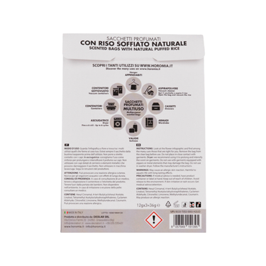Horomia geurzakjes Vaniglia e Mirra bevatten natuurlijke gepofte rijst en verspreiden tot 12 weken een rijke geur van roos, citrus, kaneel, mirre, vanille, witte musk en cederhout. Geschikt voor kledingkasten, lades, wasdroger, stofzuiger, auto en vacuümzakken.