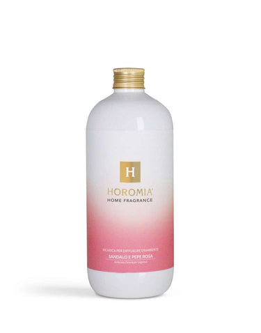 SANDALO E PEPE ROSA Home Fragrance is Horomia's nieuwe lijn geurstokjes. De navulling voor de geurstokjes bevat 500 ml parfum. Amber, papyrus, rode mirre, sandelhout, roze peper.