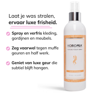 Horomia is dé favoriete textielspray uit Italië. Dankzij verfijnde geurcomposities ruikt je textiel niet alleen heerlijk fris, maar blijft de geur ook dagenlang hangen in je kleding én je interieur. Eén keer gebruiken, en je wilt nooit meer zonder.