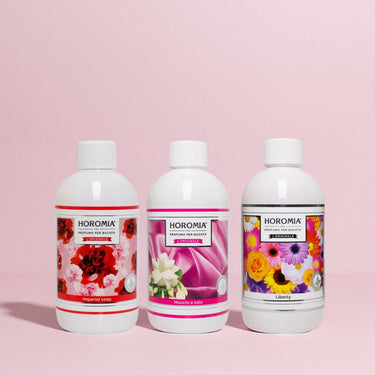 Deze set bevat drie 500 ml flessen wasparfum van Horomia in de geliefde geuren Muschi e Loto, Liberty en Imperial Soap. Een harmonieuze combinatie van zachte, frisse en bloemige tonen die je was een langdurige, luxe geurbeleving geven.